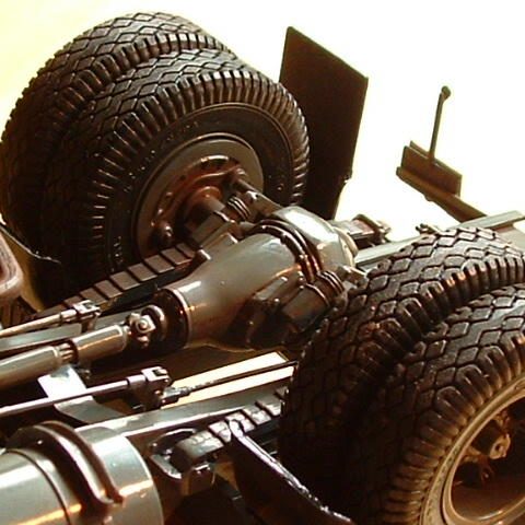 Der eigentliche Bau begann mit dem Zusammenbau des Chassis, an das die Achsen, sowie die Tankhalterungen usw. angeklebt wurden. Die Tanks wurden separat verspachtelt und lackiert. Das fertige Fahrgestell habe ich schließlich ausgiebig gealtert, nur um schließlich hocherfreut festzustellen, dass man im Nachhinein nichts mehr davon sehen konnte. Ich ließ mich von dieser Tatsache allerdings nicht entmutigen und begann an dem sehr schön detaillierten Motor zu arbeiten. Dieser freute sich so sehr über seine Alterung, dass er gar nicht daran denken wollte in den Tiefen des Chassis zu verschwinden und unter ziemlicher Spannung verklebt werden musste. Probleme bereitete mir auch die Lenkung und die drehbaren Vorderräder, deren Befestigungszapfen eindeutig unterdimensioniert ausfallen. Aber letztendlich ging dann doch alles gut und als das Ganze auf eigenen Rädern stand war die schwierigste Bauphase überstanden.