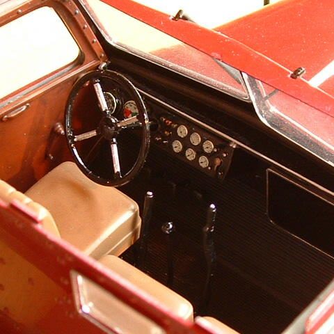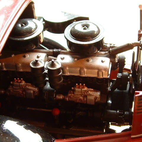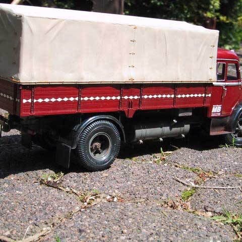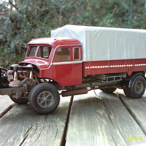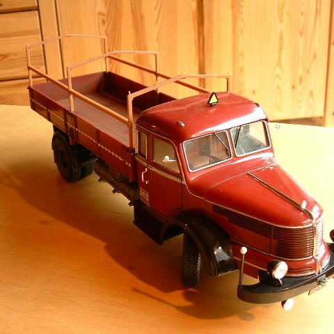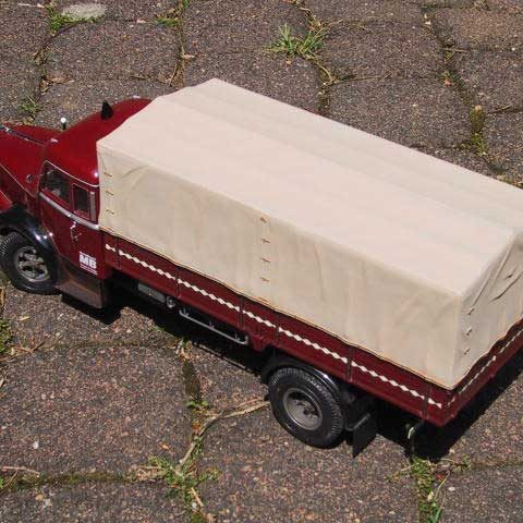 Als nächstes wurde die Pritsche zusammengebaut die dank ihrer hervorragenden Passgenauigkeit fast schon ohne Klebstoff auskommen würde. Nach dem Lackieren wurde auch hier gealtert, um eine Oberfläche zu erreichen die an lackiertes Holz erinnern sollte. Außerdem wollte ich durch einen anderen Glanzgrad erreichen, das sich die Oberfläche von der des Führerhaues deutlich unterscheidet. Es sieht zwar nicht so ganz aus wie ich es mir vorgestellt habe, aber ich war und bin trotzdem zufrieden und so kam als nächstes die Inneneinrichtung des Fahrerhauses dran, die nach ihrer Fertigstellung ebenfalls noch leicht gealtert wurde. Das mehrteilige Fahrerhaus habe ich um die Inneneinrichtung herum verklebt und schließlich dunkelrot lackiert. Die Kotflügel und die verspachtelte Stoßstange bekamen einen schwarzen Farbüberzug. Kniffelig wurde es noch mal als die Kotflügel an Schnauze und Fahrerhaus geklebt werden sollten, da die lackierten Teile ohne Befestigungszapfen aufeinander verklebt werden mussten. Aber auch das war schließlich geschafft und mit Farbpigmentstaub wurde an verschiedenen Stellen Verschmutzungen und Rostspuren aufgetragen. Die umlaufenden Chromleisten wollte ich eigentlich mit Bare Metal Foil darstellen. Die die ich zur Verfügung hatte, war allerdings nicht anschmiegsam genug und so griff ich hierfür schließlich auf einen silbernen Lackstift zurück. Schließlich wurde noch die verspachtelte Plane Beige lackiert, schattiert und Ösen und Schnüre farblich abgesetzt.