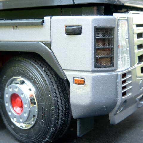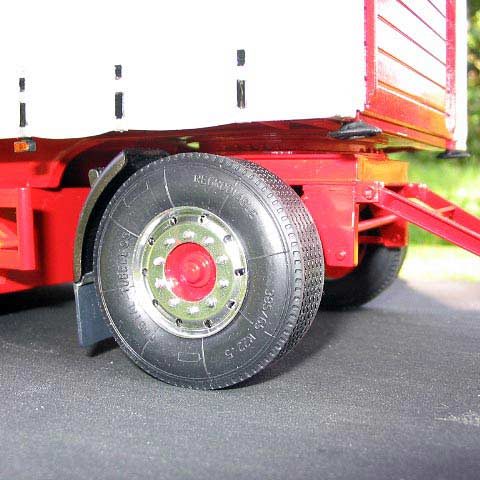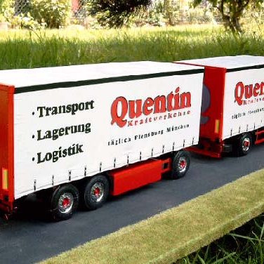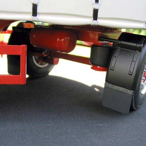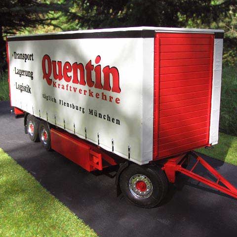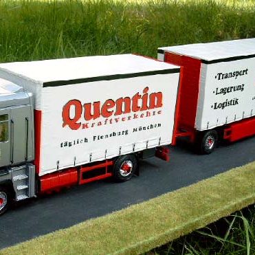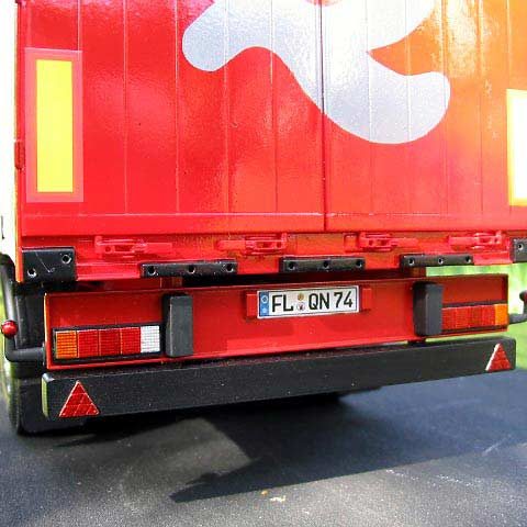Die Lackierung der Fahrerkabine der Zugmaschine erfolgte mit einer Mischung aus Testors-Farben, gefolgt von zwei Schichten Klarlack von Revell. Der markante Kühlergrill wurde mit Testors Silberfarbe lackiert, und das Renault-Logo wurde mit Chromfolie von Revell beklebt. Die Felgen wurden mit Alclad Polished Aluminium lackiert. Die Beschriftung der Planen erfolgte mit einem ALPS-Drucker. Das „Q“ auf den Hecktüren wurde mit Hilfe einer Schablone aufgetragen. Die Nummernschilder habe ich ebenfalls selbst gedruckt.