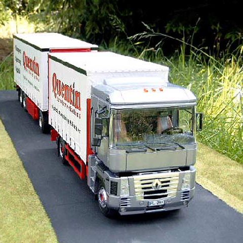 Sowohl der Zusammenbau der Kabine als auch des Fahrgestells verlief jeweils zügig und ohne Probleme. An der Beifahrerseite der Zugmaschine wurde ein Ansauggitter, welches für die neueren Renault-Modelle typisch ist, integriert. Die Curtainside-Aufbauten mussten an die unterschiedlichen Längen der Fahrgestelle von Zugmaschine und Anhänger angepasst werden. Beim Anhänger wurde die Plane zusätzlich um die vorderen Ecken mittels 45-Grad-Schnitten auf der Kreissäge herumgeführt. Die obere Gummilippe an den Längsseiten der Plane wurde mit einem 6 mm breiten Tamiya-Abklebeband und gummifarbener Lackierung dargestellt. Die Chromfelgen des Lastkraftwagens stammen aus einem US-Truckbausatz, während die des Anhängers von KFS stammen, welche jedoch mit Radnaben von Italeri-Felgen versehen wurden. Der vordere Drehschemel und die Deichsel sind aus Evergreen-Profilen gefertigt, die Kotflügel sind Resinteile.